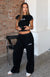 The Original Track Pants Black are designed for easy days. Featuring an elasticated waistband with drawstring. wide leg design. side pockets and unlined material. finished with a logo embellishment on the front side leg. Pair with the The Original Baby Tee for the cutest lounge look ever!