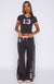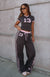 No cool girl wardrobe is complete without the Trying Too Hard Track Pants in Volcanic! Features elastic and drawstring waistband. double stripe side paneling. wide leg. 13 graphic side front and White Fox graphic side front. Complete the look with the matching Trying Too Hard Baby Tee in Volcanic.